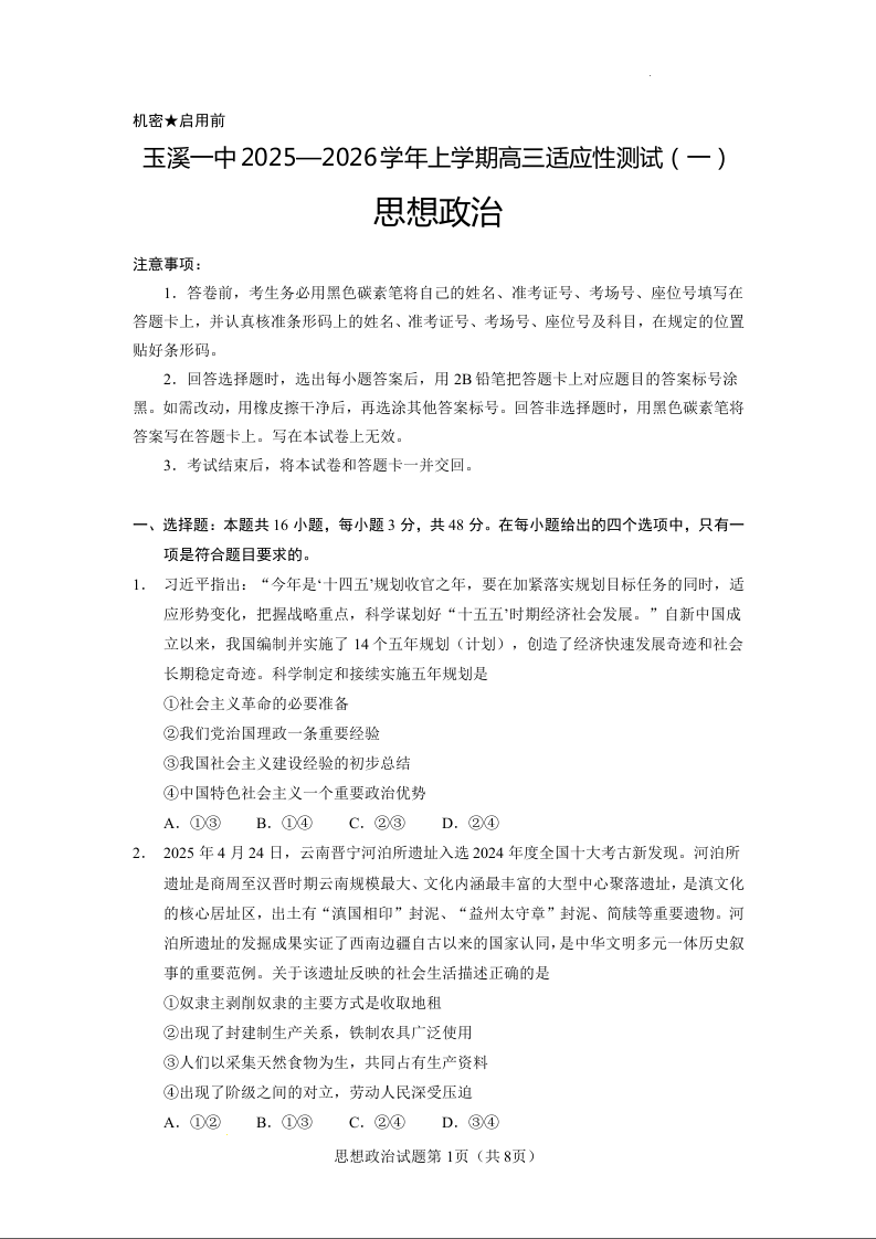 云南省玉溪第一中学2025-2026学年高三上学期适应性测试(一)政治.docx
