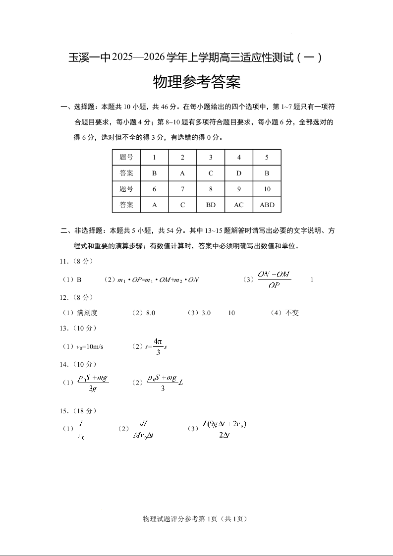 云南省玉溪第一中学2025-2026学年高三上学期适应性测试(一)物理答案.docx