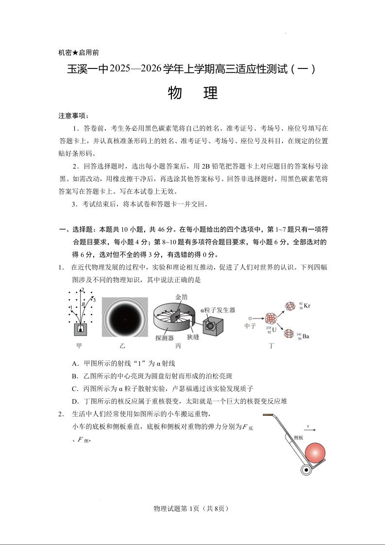 云南省玉溪第一中学2025-2026学年高三上学期适应性测试(一)物理.docx
