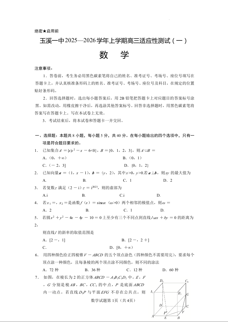 云南省玉溪第一中学2025-2026学年高三上学期适应性测试(一)数学.docx