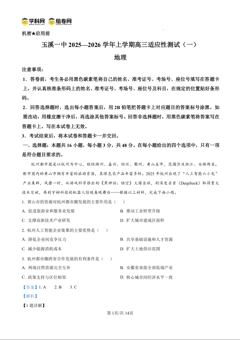 云南省玉溪第一中学2025-2026学年高三上学期适应性测试(一)地理答案.docx