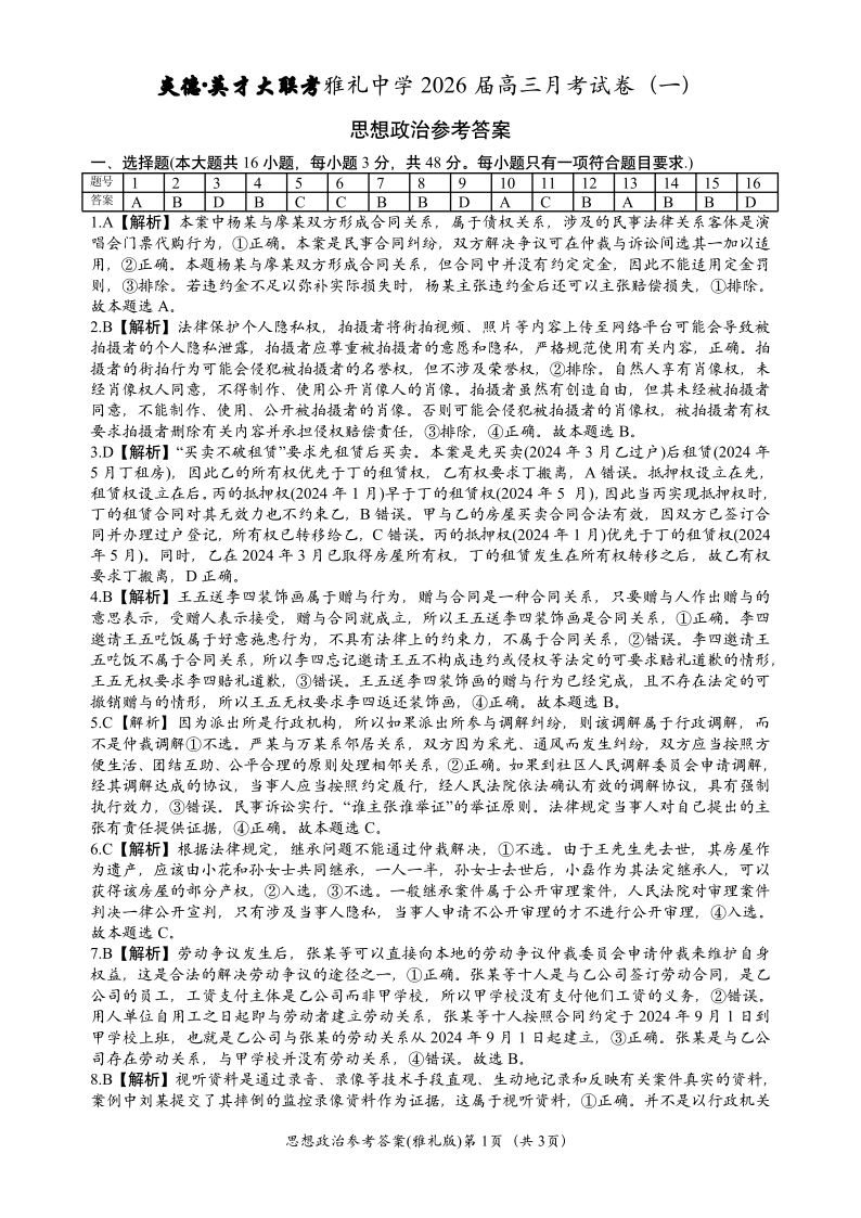 炎德·英才大联考雅礼中学2026届高三月考试卷(一)政治答案.pdf
