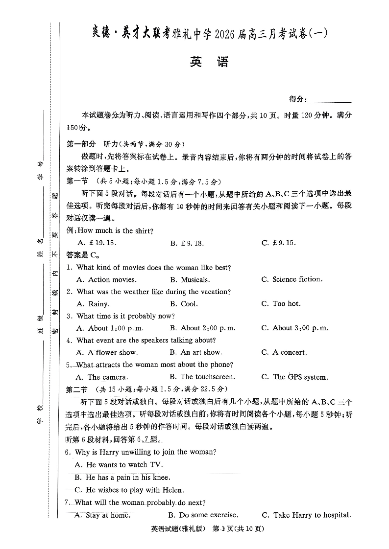 炎德·英才大联考雅礼中学2026届高三月考试卷(一)英语.pdf
