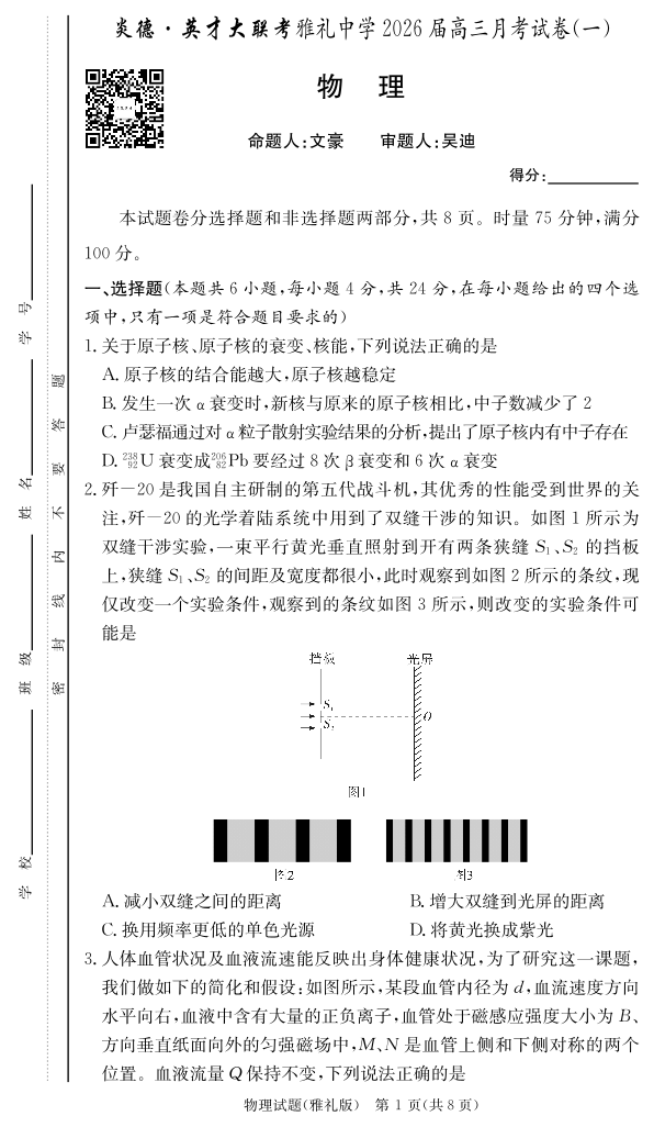 炎德·英才大联考雅礼中学2026届高三月考试卷(一)物理.pdf
