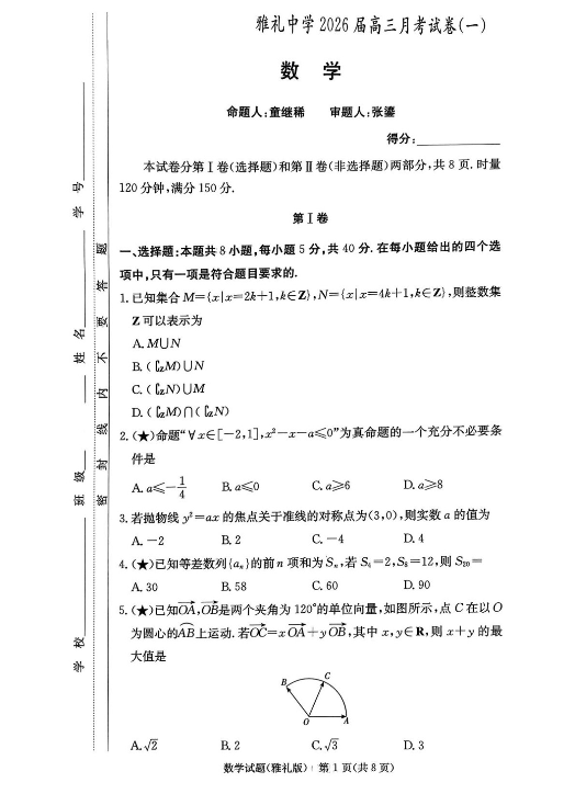 炎德·英才大联考雅礼中学2026届高三月考试卷(一)数学.pdf