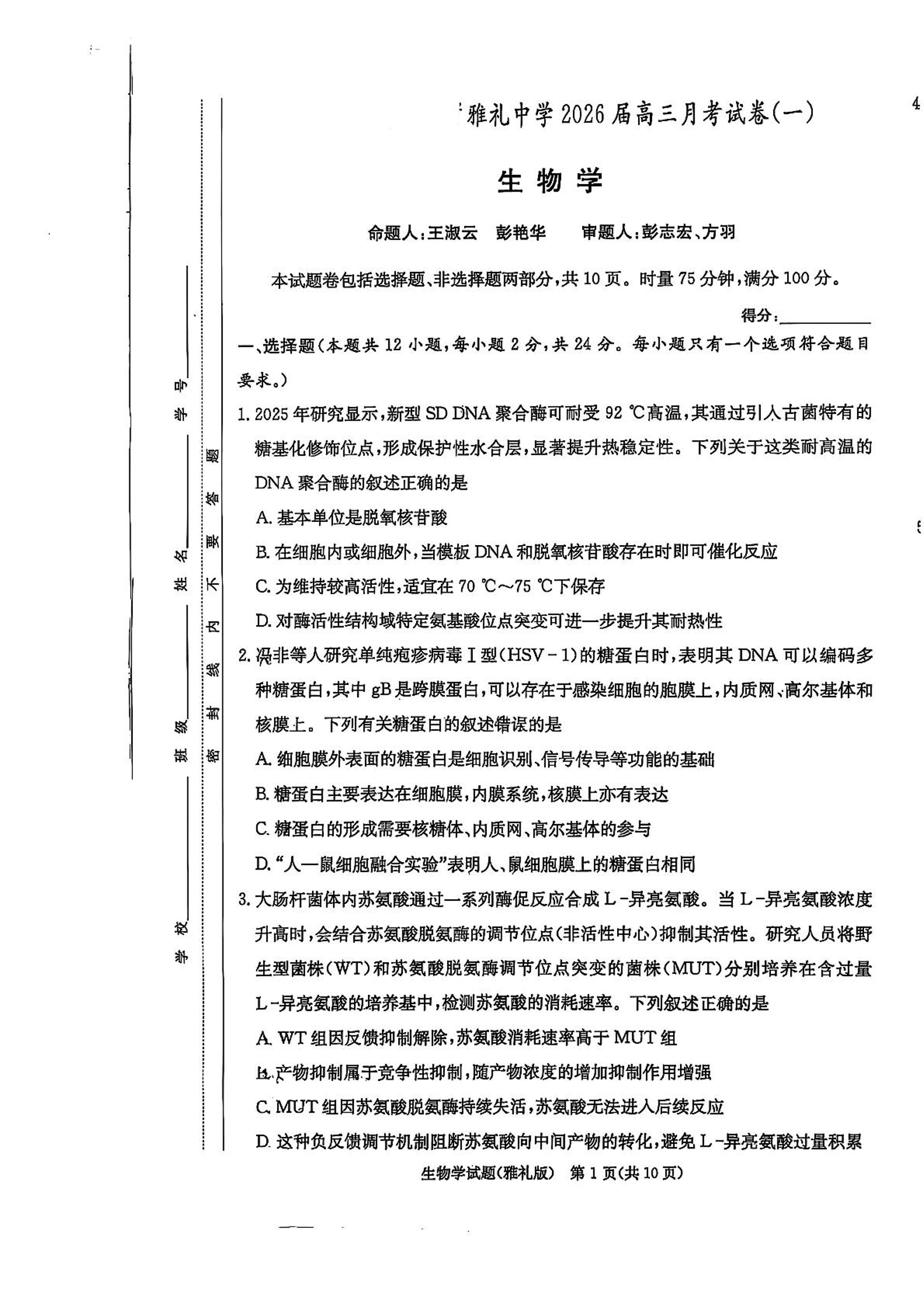 炎德·英才大联考雅礼中学2026届高三月考试卷(一)生物.pdf