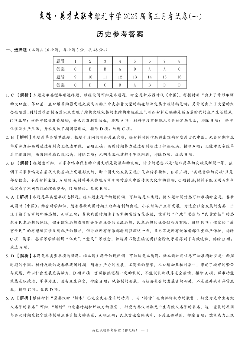 炎德·英才大联考雅礼中学2026届高三月考试卷(一)历史答案.pdf