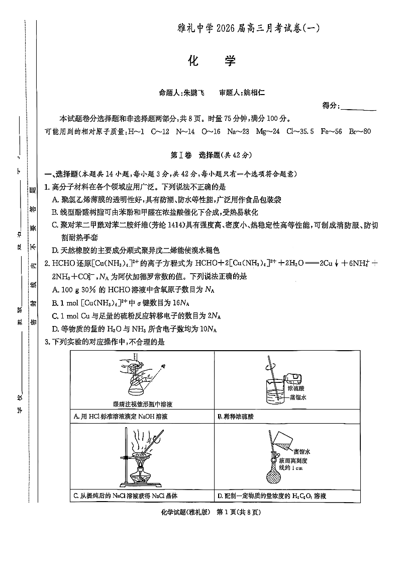 炎德·英才大联考雅礼中学2026届高三月考试卷(一)化学.pdf