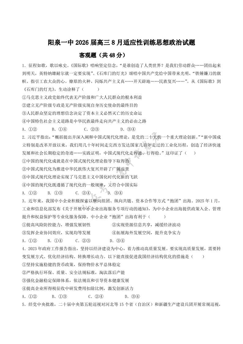 山西省阳泉一中2026届高三8月适应性训练 政治试题(含答案).pdf