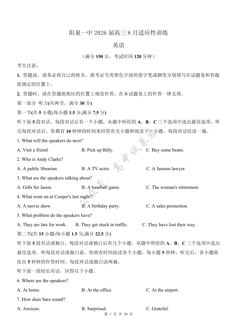 山西省阳泉一中2026届高三8月适应性训练 英语试题(含答案).pdf