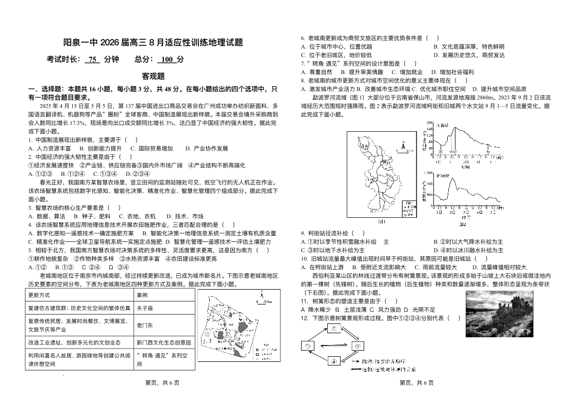 山西省阳泉一中2026届高三8月适应性训练 地理试题(含答案).pdf