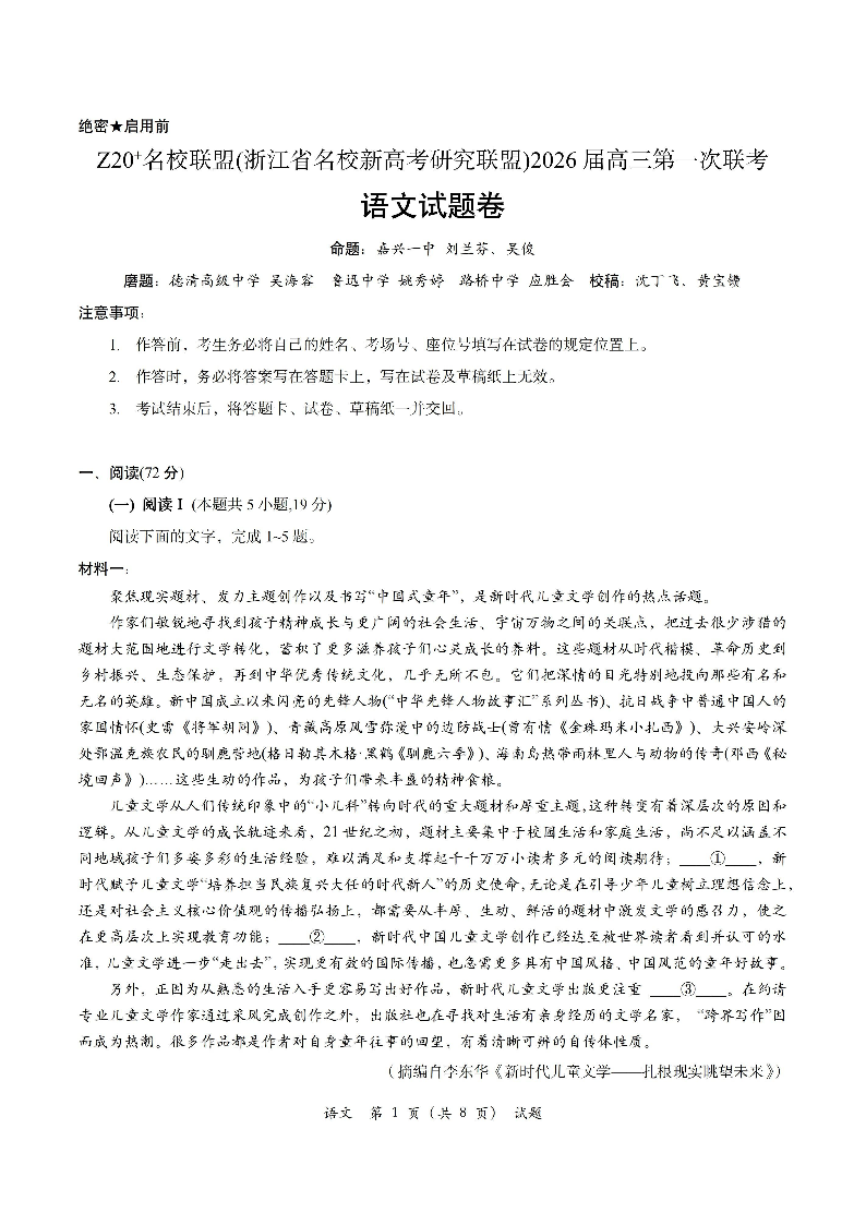 Z20+名校联盟(浙江省名校新高考研究联盟)2026届高三第一次联考 语文.pdf