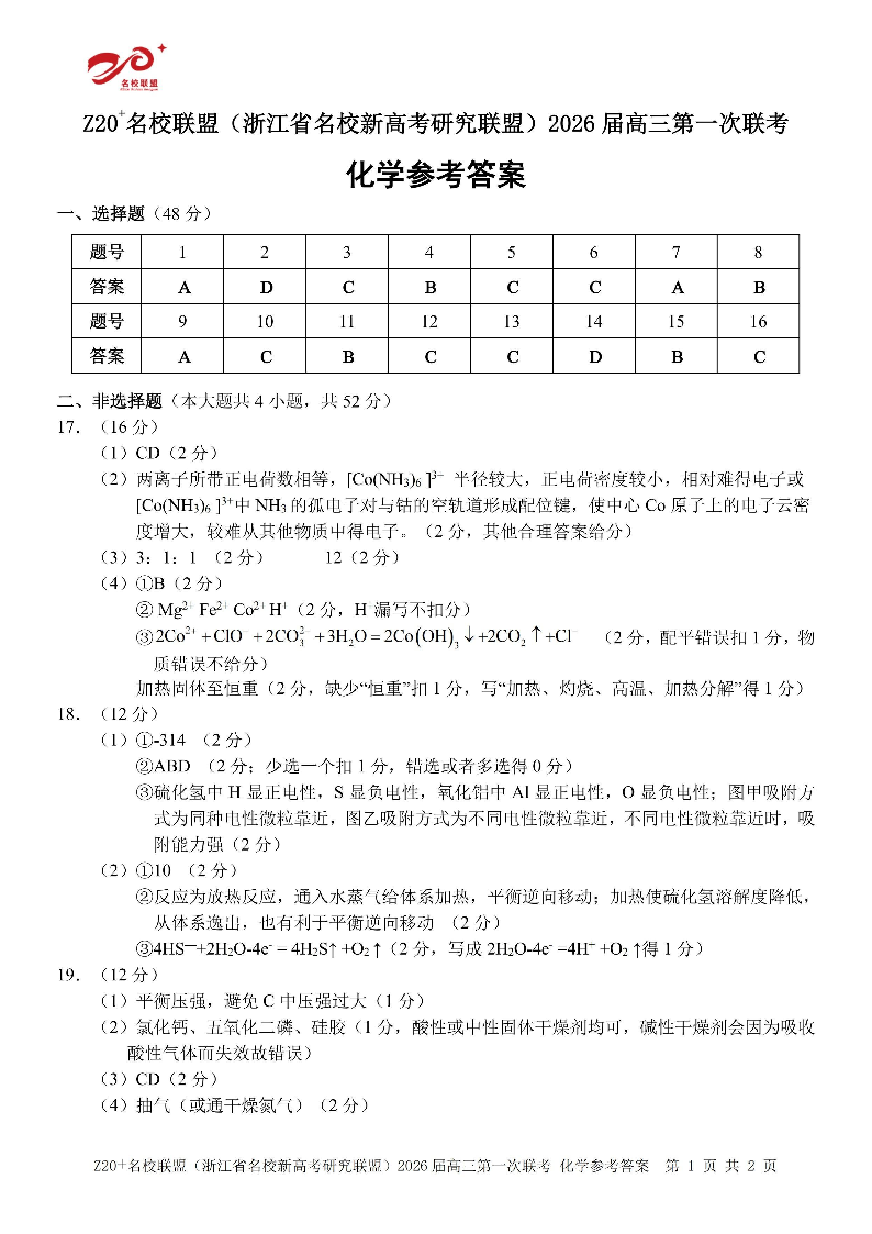 Z20+名校联盟(浙江省名校新高考研究联盟)2026届高三第一次联考 化学答案.pdf