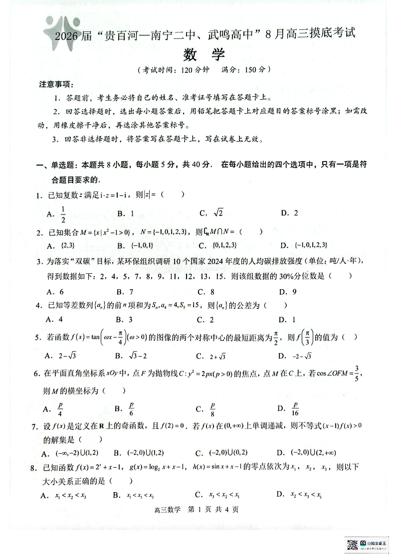 2026届“贵百河一南宁二中、武鸣高中”8月高三摸底考试 数学.pdf