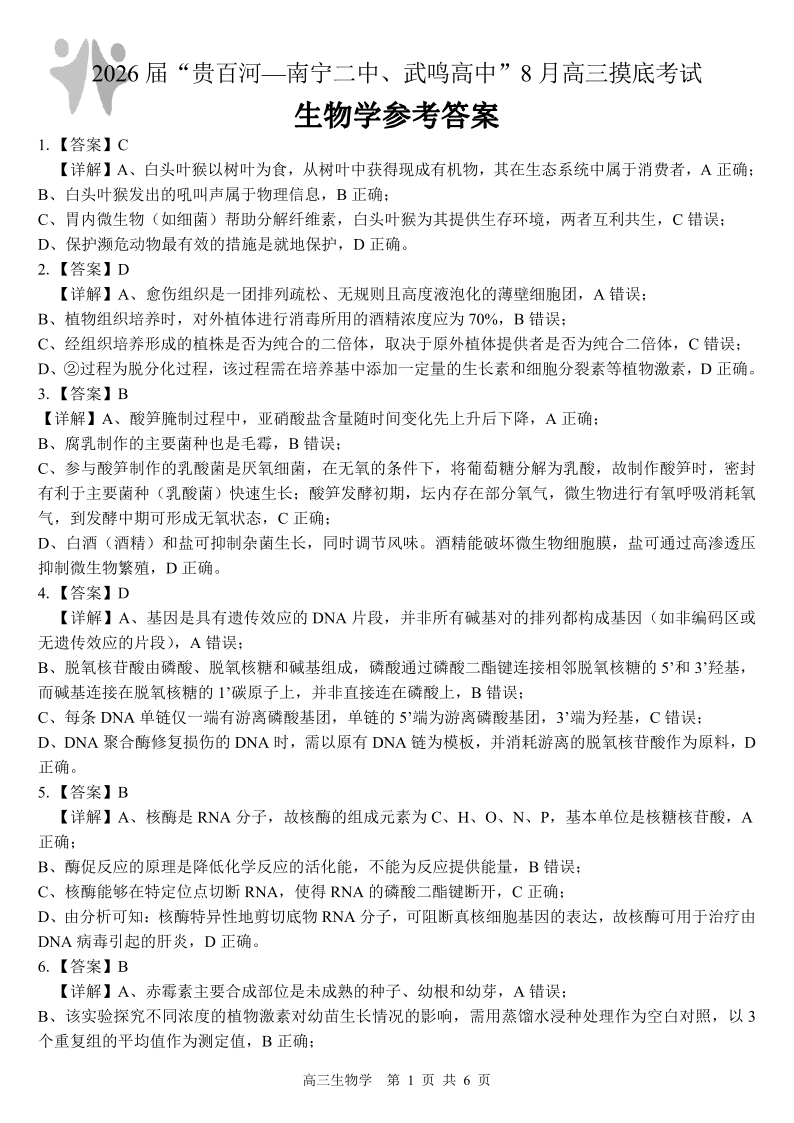 2026届“贵百河一南宁二中、武鸣高中”8月高三摸底考试 生物答案.pdf