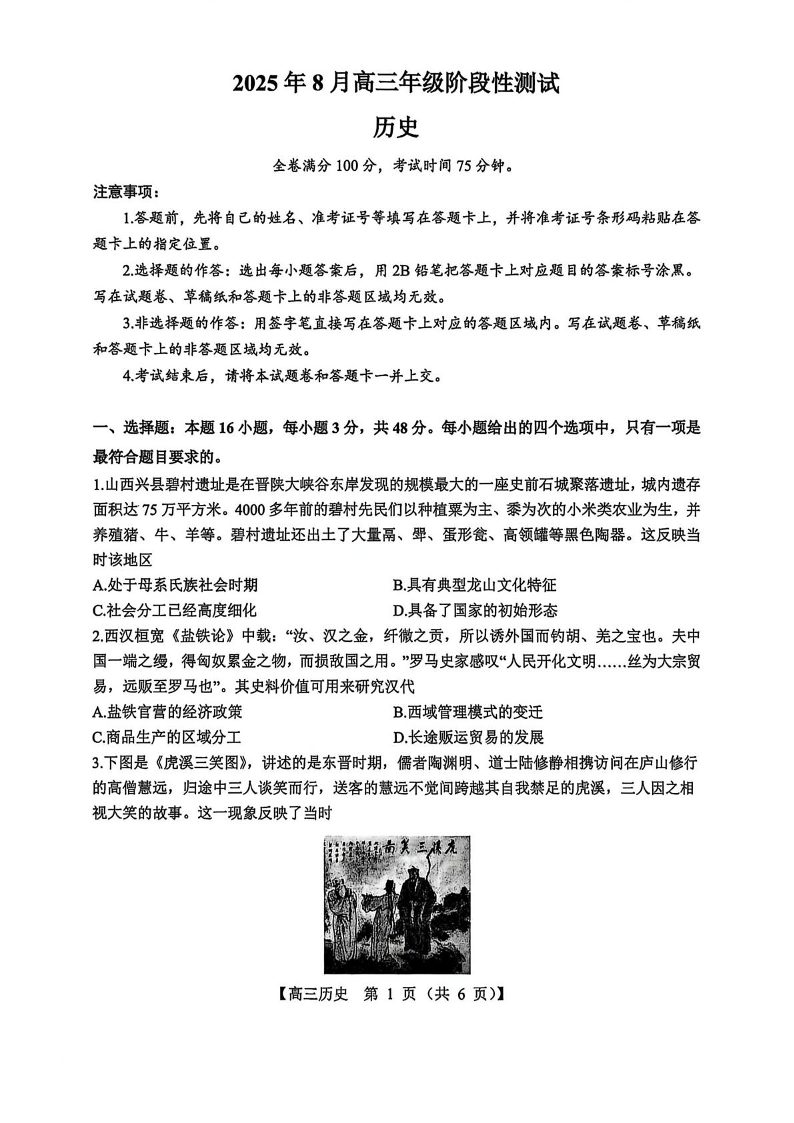 山西省忻州市部分学校2025年8月高三年级阶段性测试 历史试卷(含答案).pdf