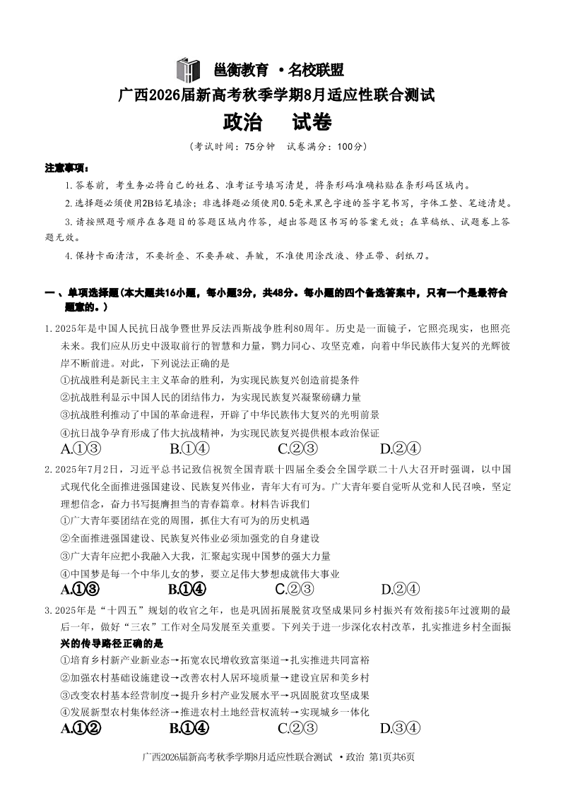 广西2026届高三年级秋季学期8月联合调研测试 政治试卷(含答案).pdf
