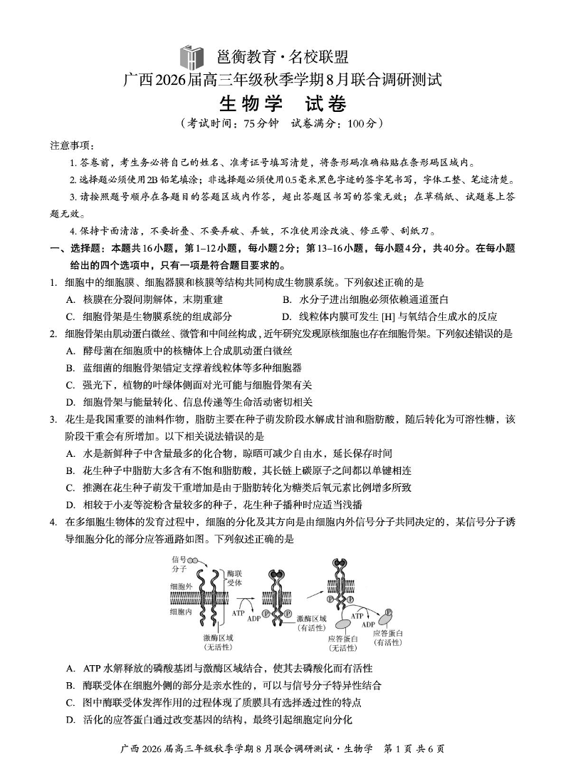 广西2026届高三年级秋季学期8月联合调研测试 生物试卷(含答案).pdf