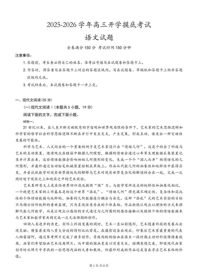 河北省衡水市冀州中学2025-2026学年高三上学期开学摸底考试 语文(含答案).pdf