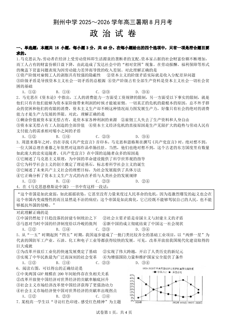 湖北省荆州中学2025-2026学年高三上学期8月月考 政治.pdf