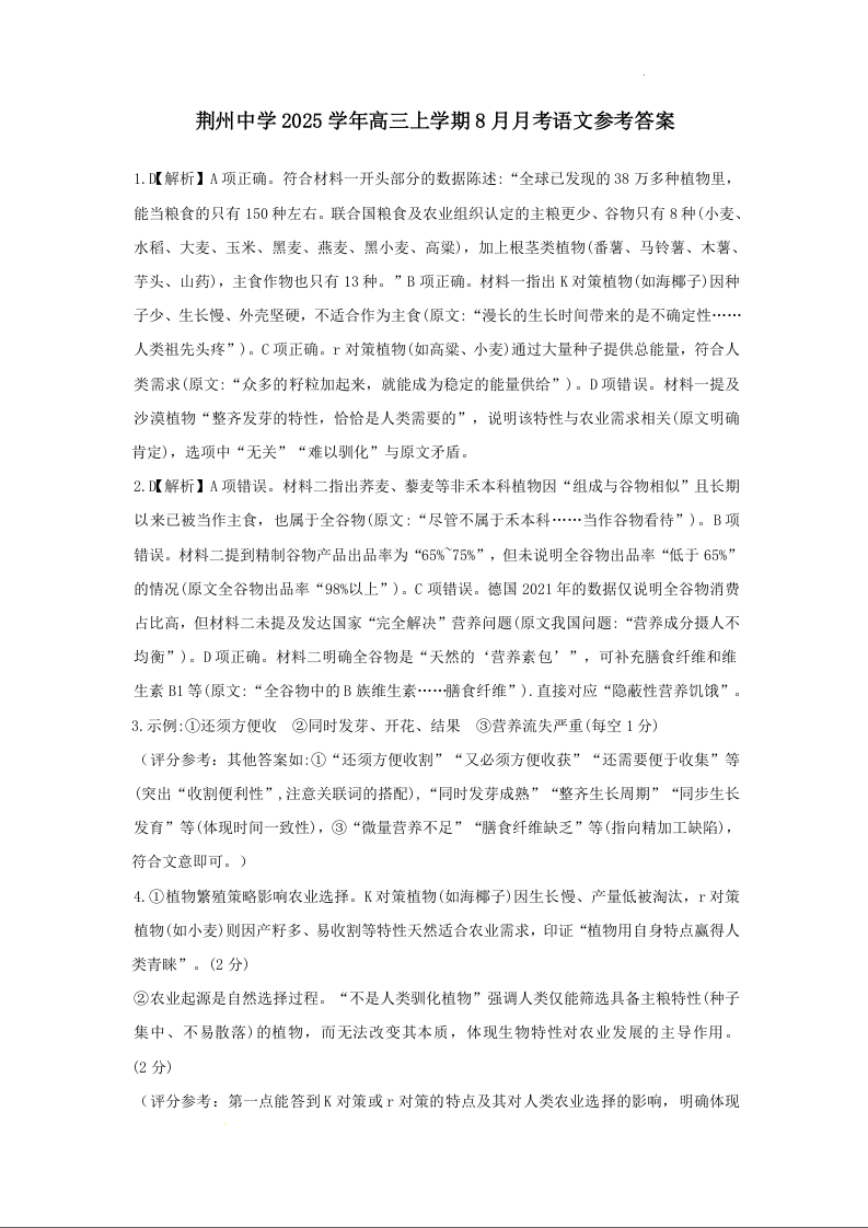 湖北省荆州中学2025-2026学年高三上学期8月月考 语文答案.docx
