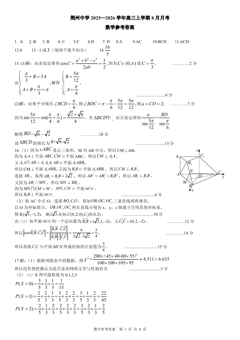 湖北省荆州中学2025-2026学年高三上学期8月月考 数学答案.pdf