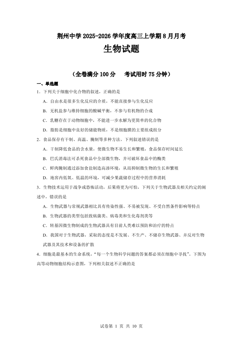湖北省荆州中学2025-2026学年高三上学期8月月考 生物.pdf