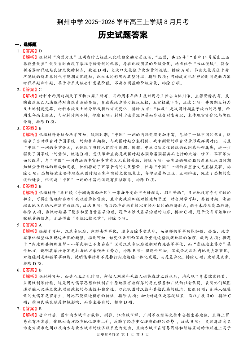 湖北省荆州中学2025-2026学年高三上学期8月月考 历史答案.pdf