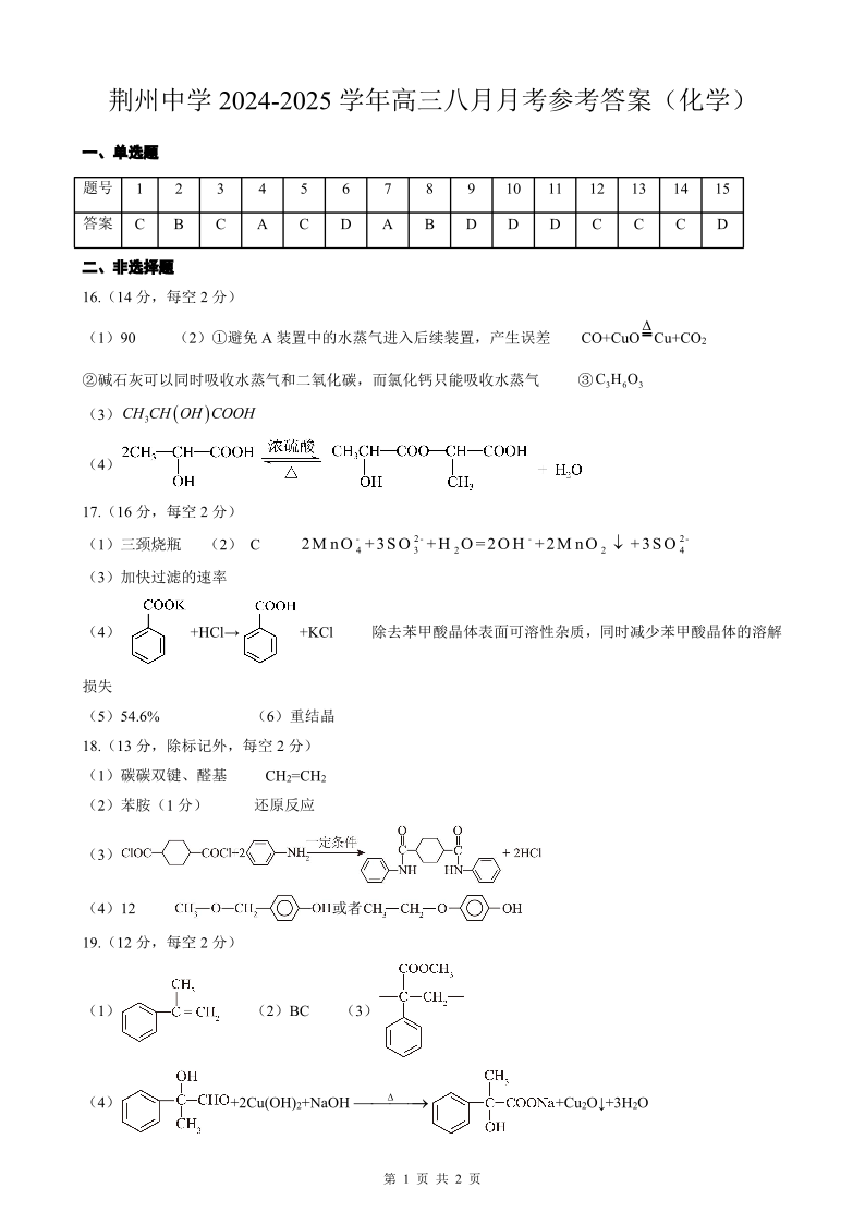 湖北省荆州中学2025-2026学年高三上学期8月月考 化学答案.pdf