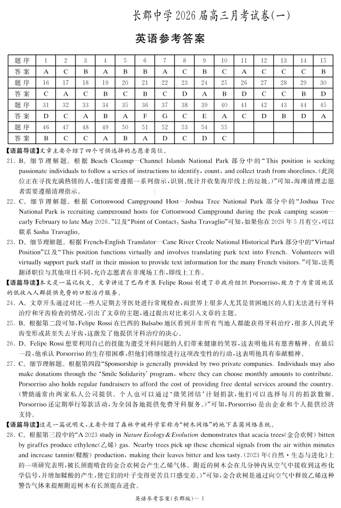 炎德·英才大联考长郡中学2026届高三月考试卷(一)英语答案.pdf