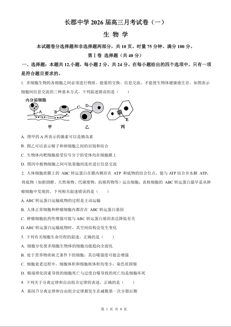 炎德·英才大联考长郡中学2026届高三月考试卷(一)生物.docx
