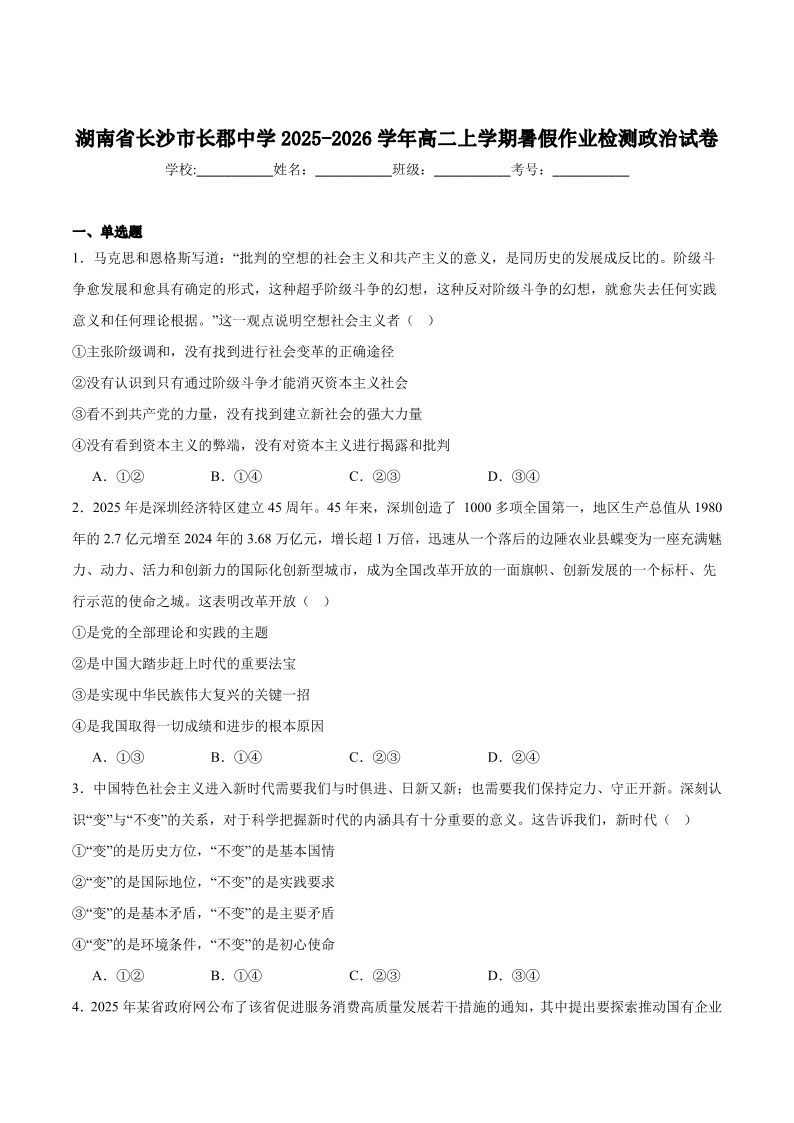 长郡中学2025年高二8月开学考试 政治试卷(含答案).pdf