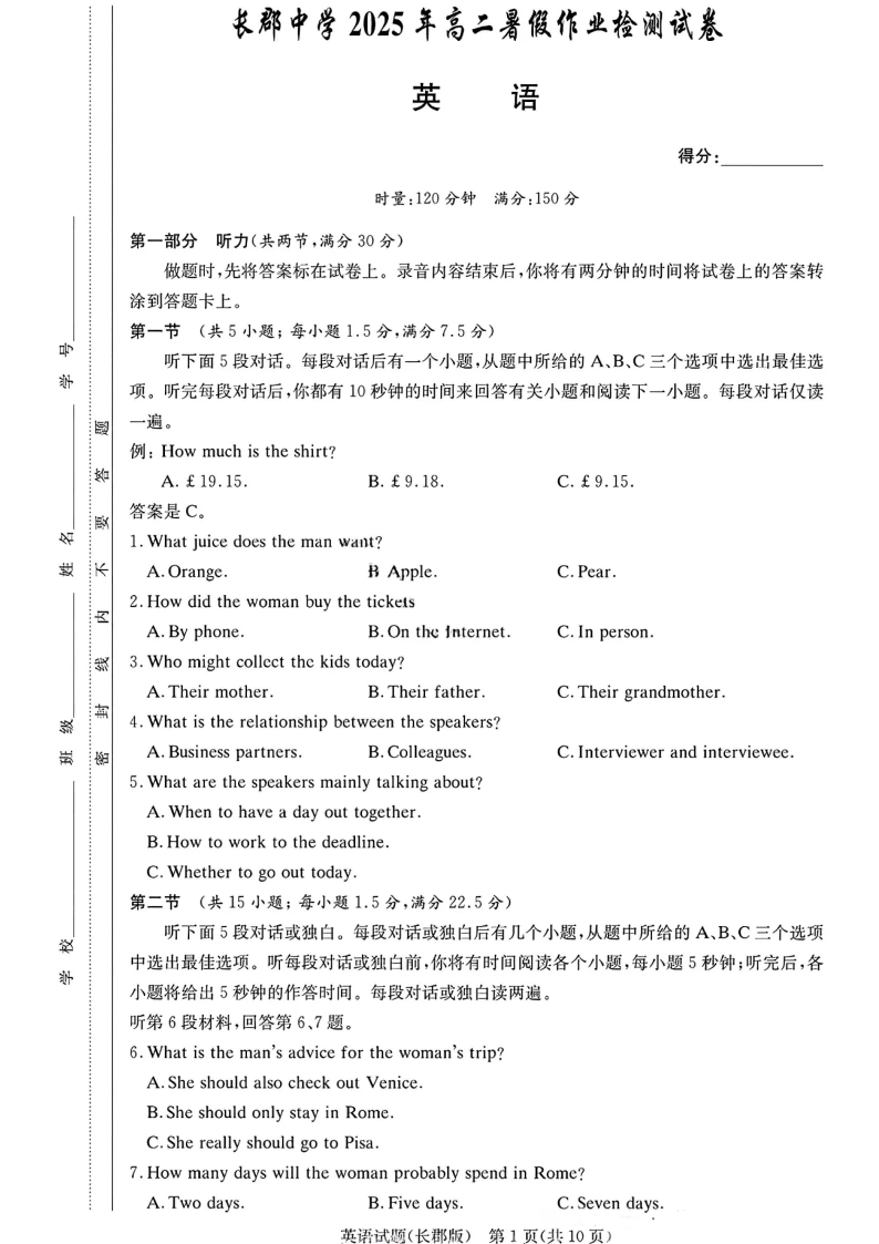 长郡中学2025年高二8月开学考试 英语试卷(含答案).pdf
