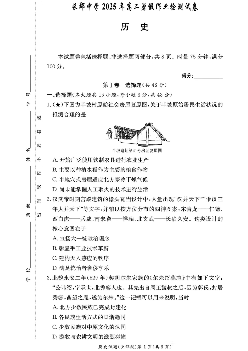 长郡中学2025年高二8月开学考试 历史试卷(含答案).pdf