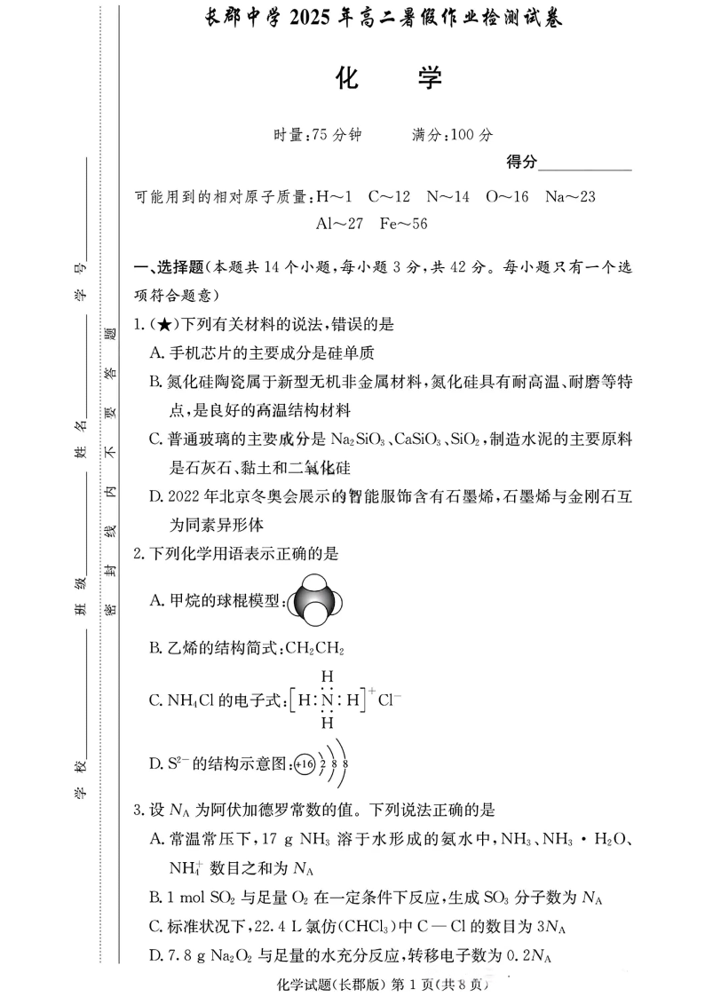 长郡中学2025年高二8月开学考试 化学试卷(含答案).pdf