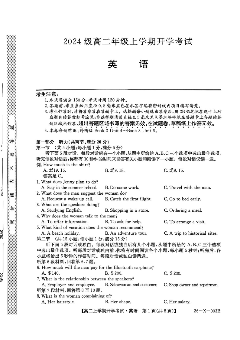 黑龙江省龙东联盟2025-2026学年高二上学期开学考试 英语试卷(含答案).pdf