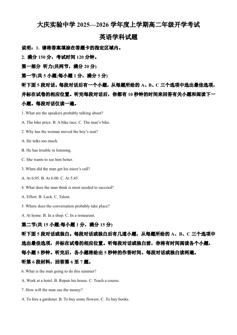 大庆实验中学2025-2026学年度上学期高二年级上开学考试 英语.pdf