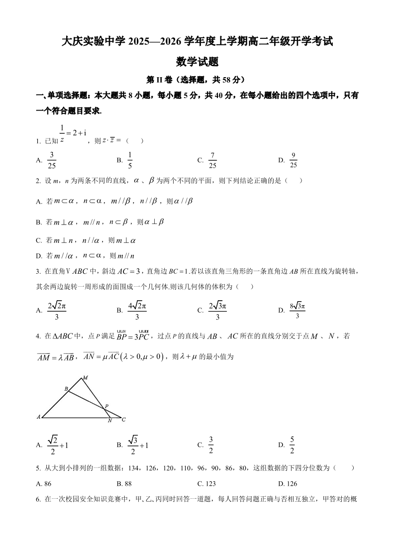 大庆实验中学2025-2026学年度上学期高二年级上开学考试 数学.pdf