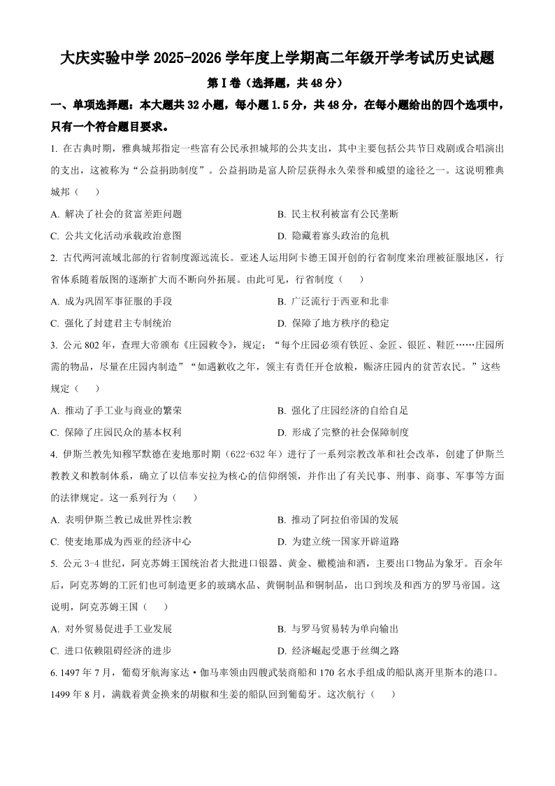 大庆实验中学2025-2026学年度上学期高二年级上开学考试 历史.pdf