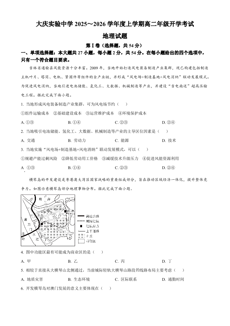大庆实验中学2025-2026学年度上学期高二年级上开学考试 地理.pdf
