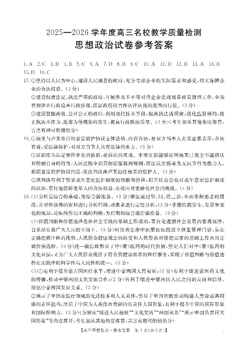 内蒙古2025-2026学年高三名校教学质量检测 政治答案.pdf
