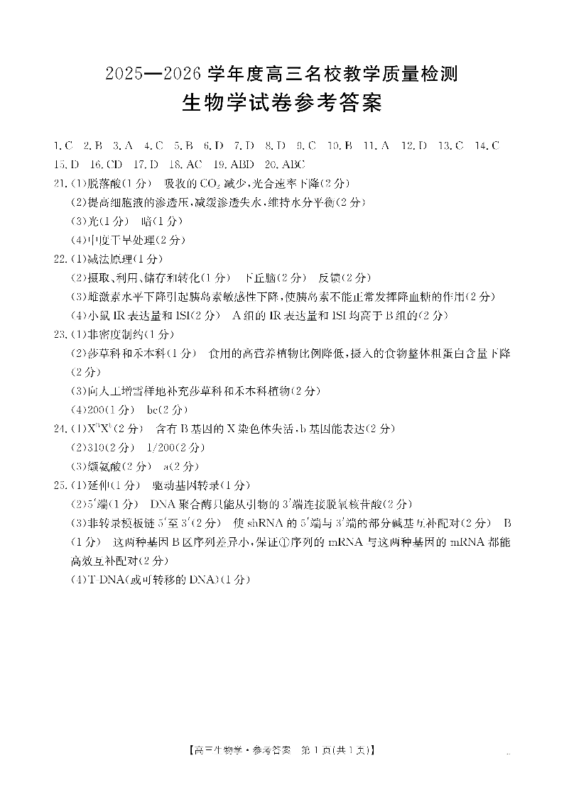 内蒙古2025-2026学年高三名校教学质量检测 生物答案.pdf