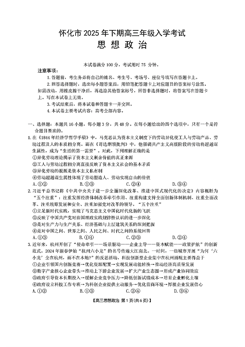 怀化市2025年下期高三年级入学考试 政治试卷(含答案).pdf