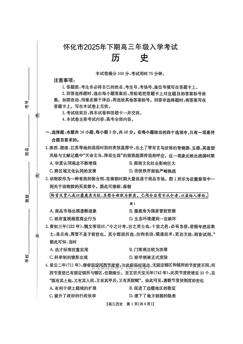 怀化市2025年下期高三年级入学考试 历史试卷(含答案).pdf