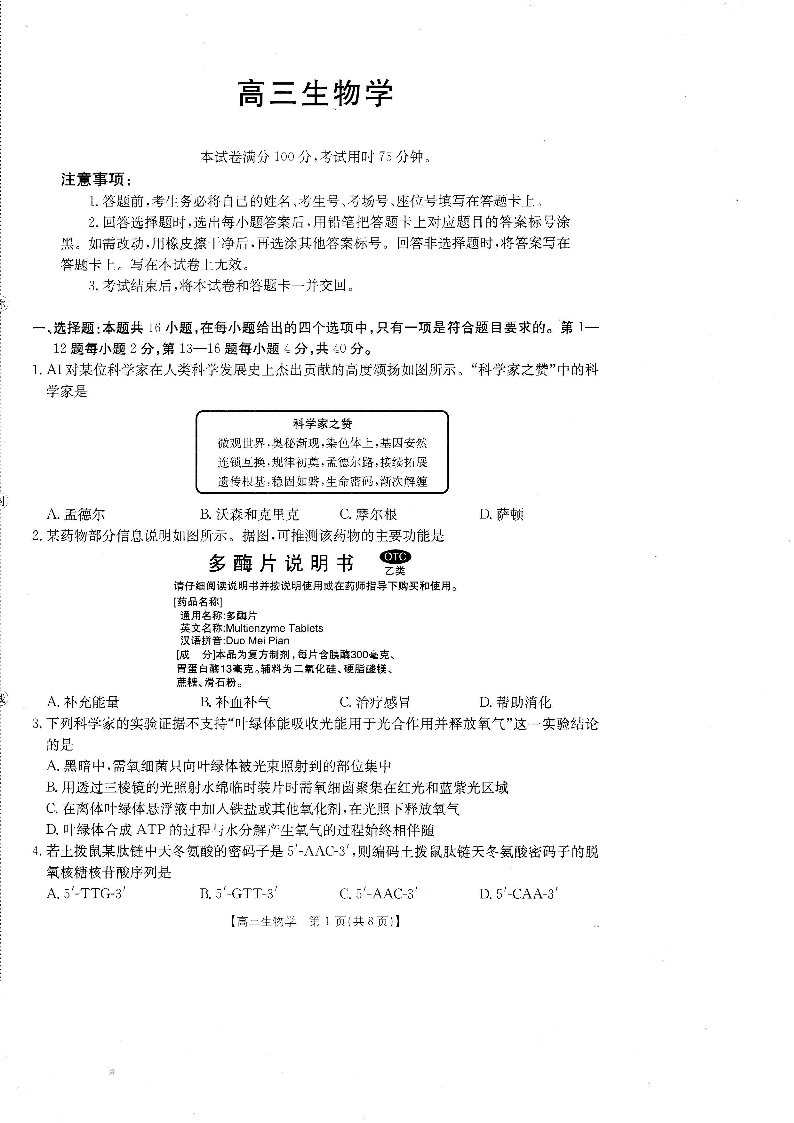 广东省2026届高三8月开学联考 生物.pdf