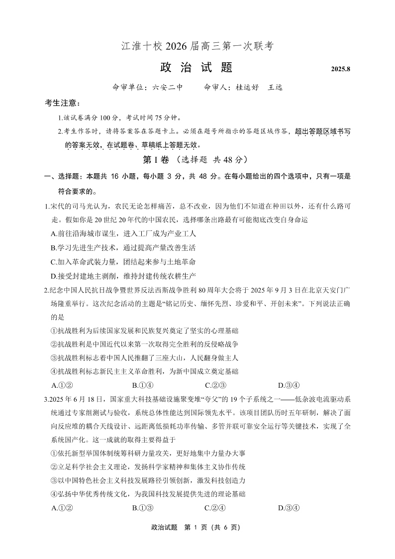 安徽省江淮十校2026届高三第一次联考 政治.pdf