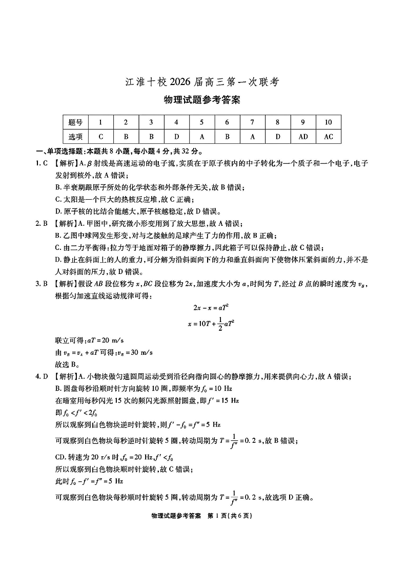 安徽省江淮十校2026届高三第一次联考 物理答案.pdf
