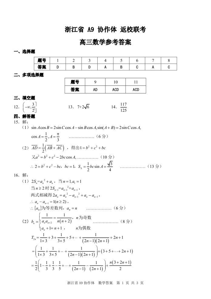 浙江省A9协作体暑假返校联考 数学答案.pdf