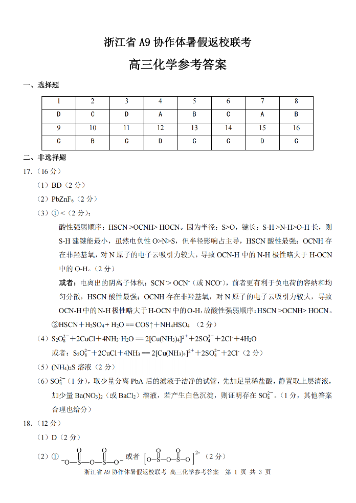 浙江省A9协作体暑假返校联考 化学答案.pdf