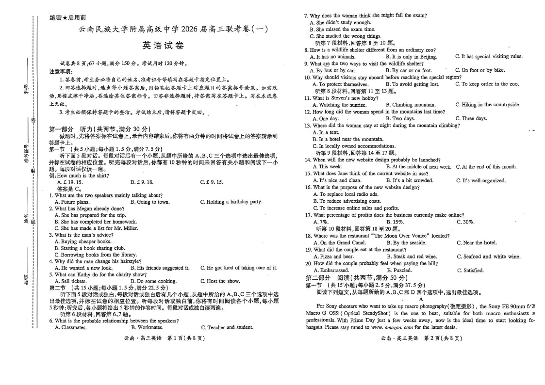 云南民族大学附属高级中学2026届高三上学期联考(一)英语试卷(含解析).pdf